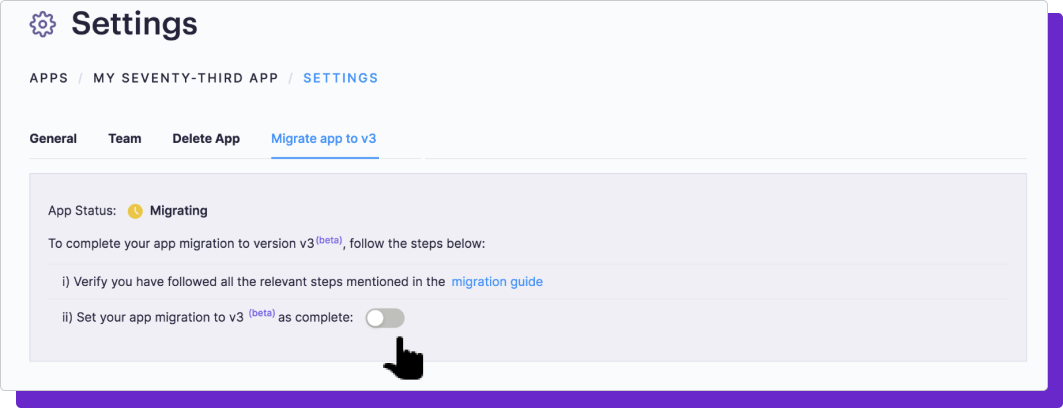 Once you’ve finished making all needed code changes, go to the dashboard and switch on the toggle to mark your app migration to v3 as complete.