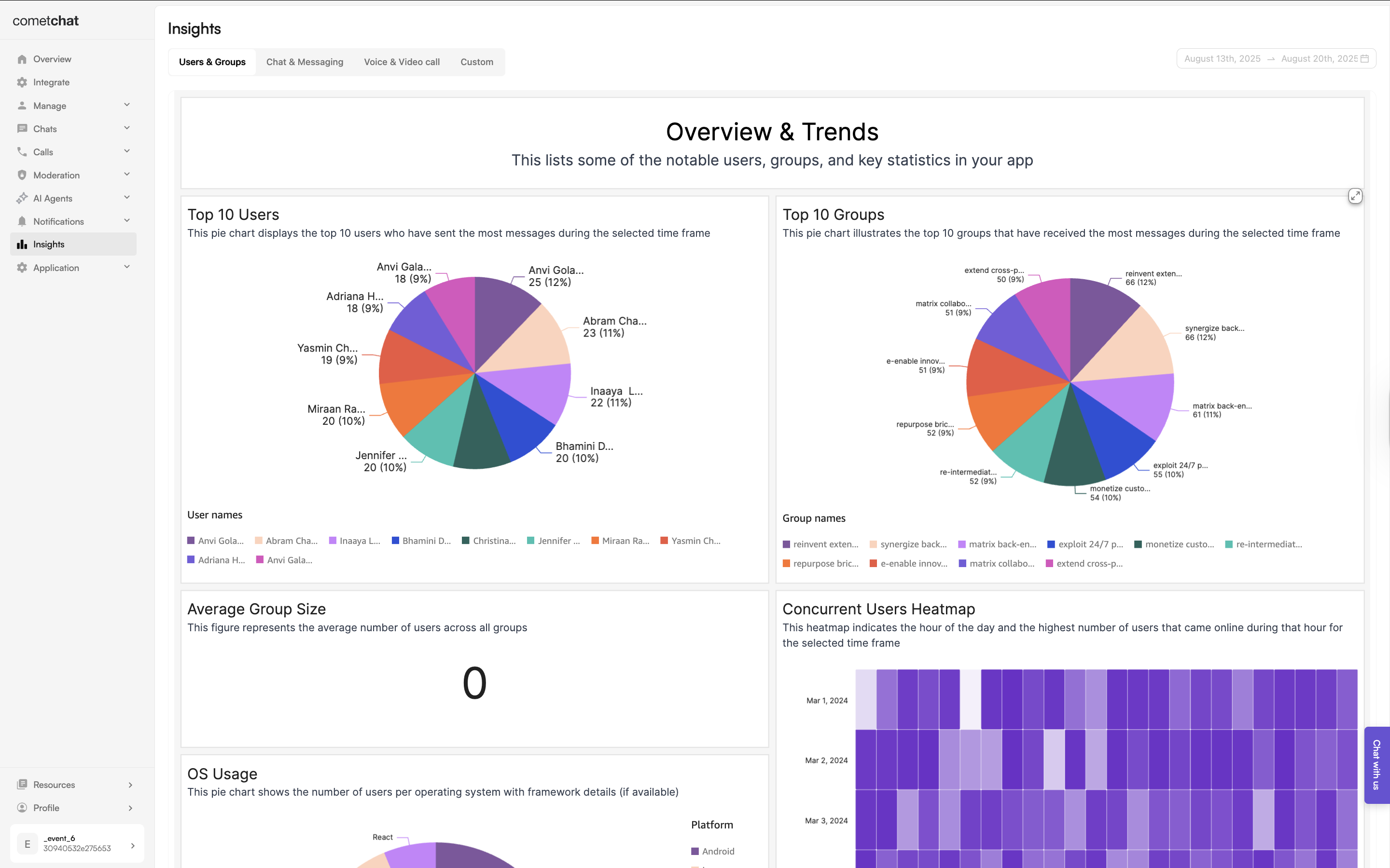- Messages sent heatmap: Displays data to indicate hours when users perfer to send messages.