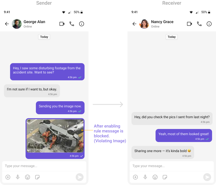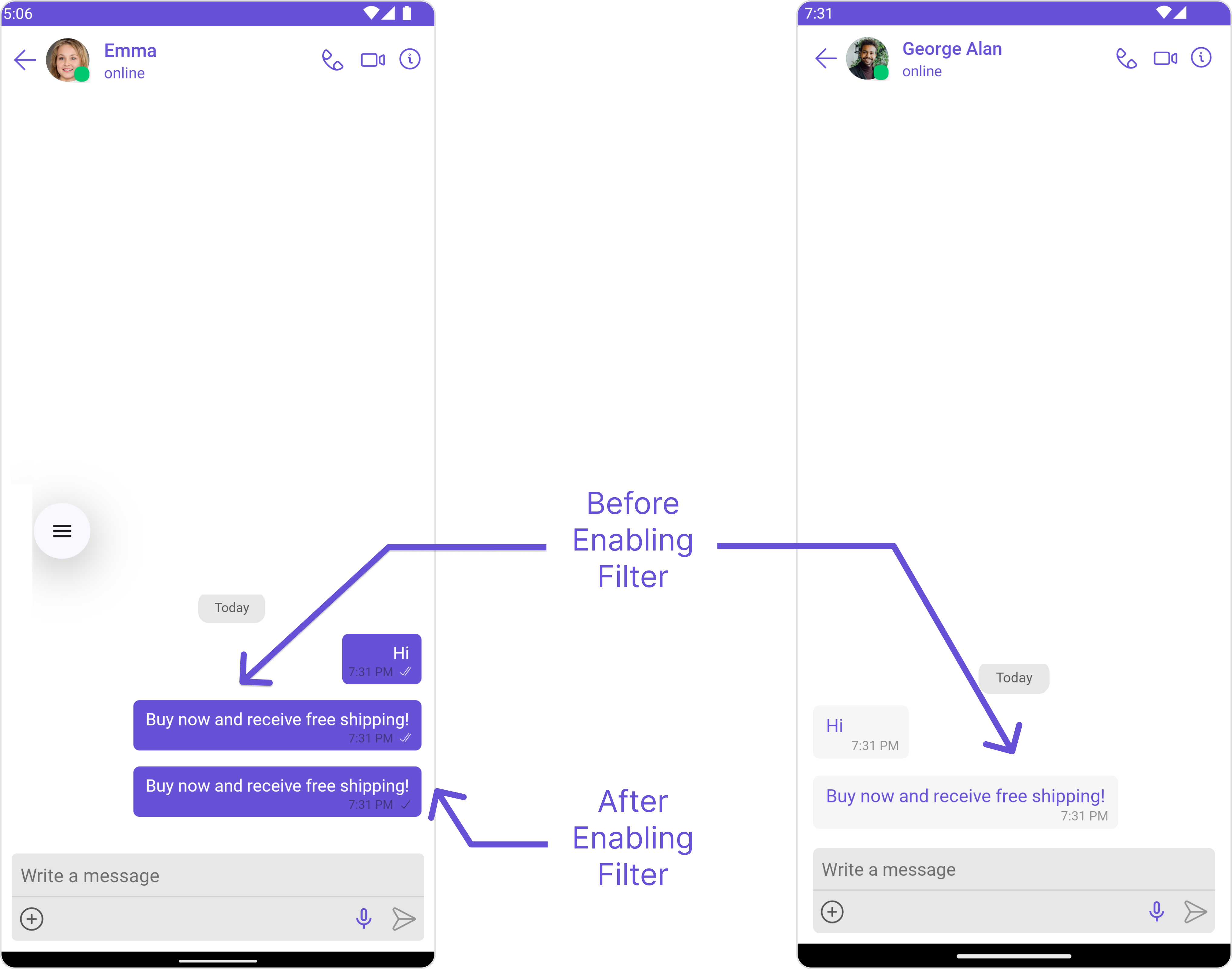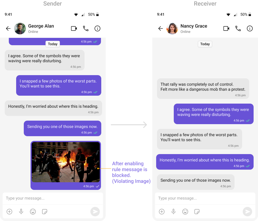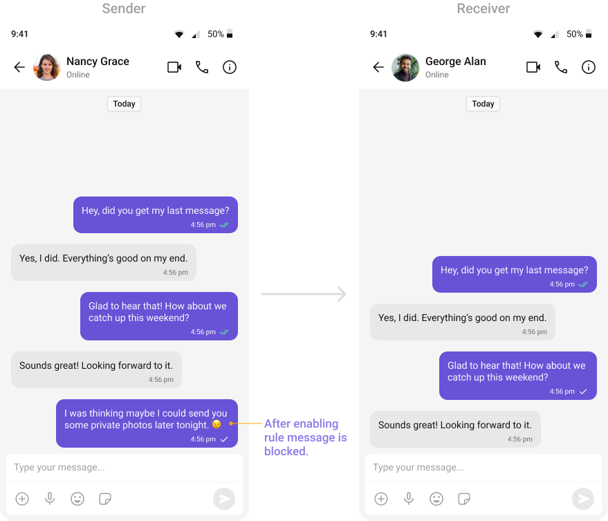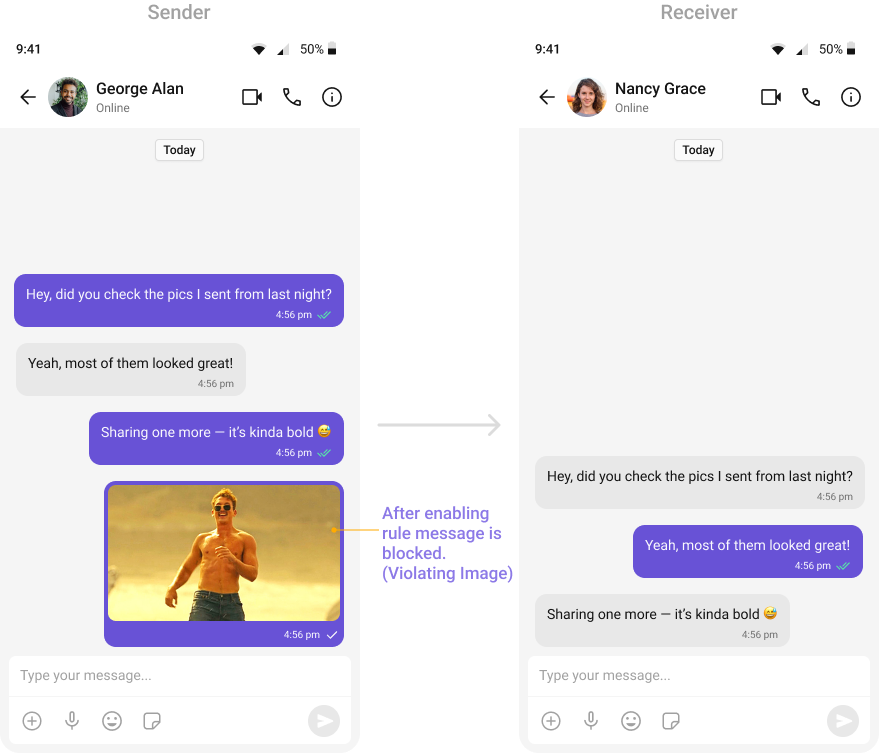 Automatically detects and blocks messages containing offensive language, profanity, or derogatory remarks using a predefined list of offensive keywords.Example: Before enabling, profane messages are delivered (double ticks). After enabling, they’re blocked (single tick).