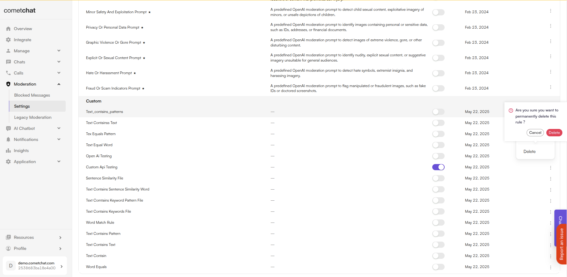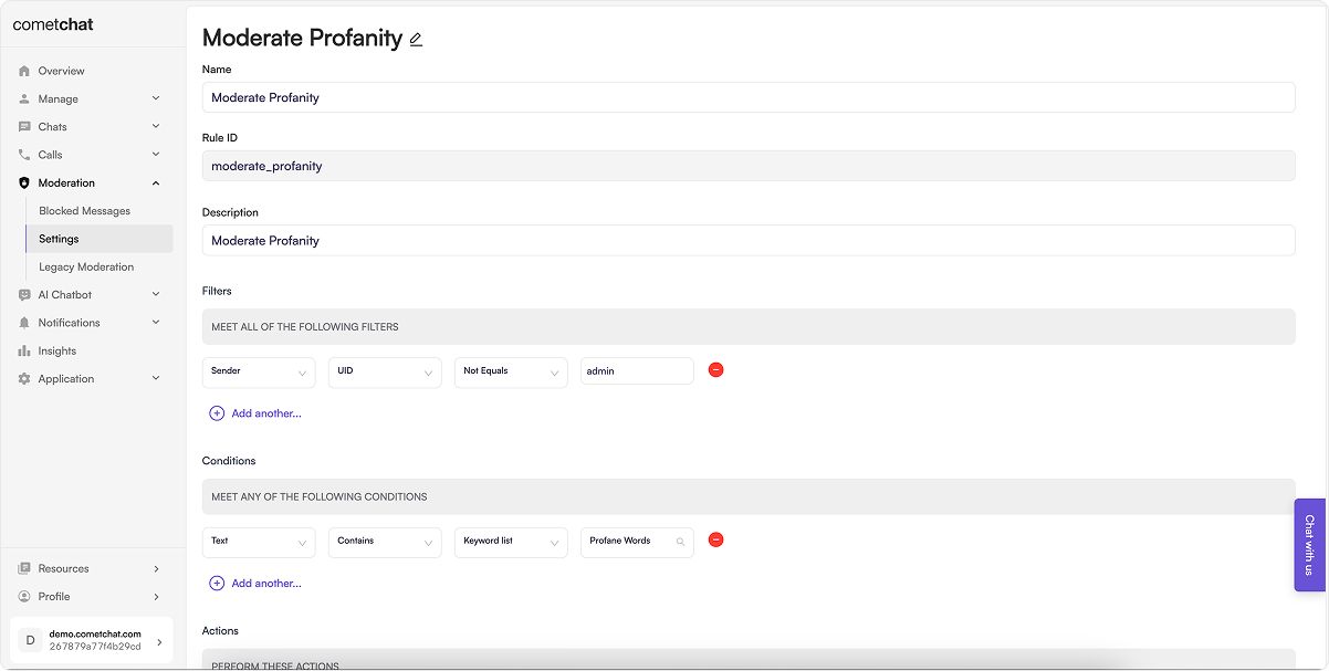 Login to CometChat Dashboard → Select your app → Moderation → Settings → Rules