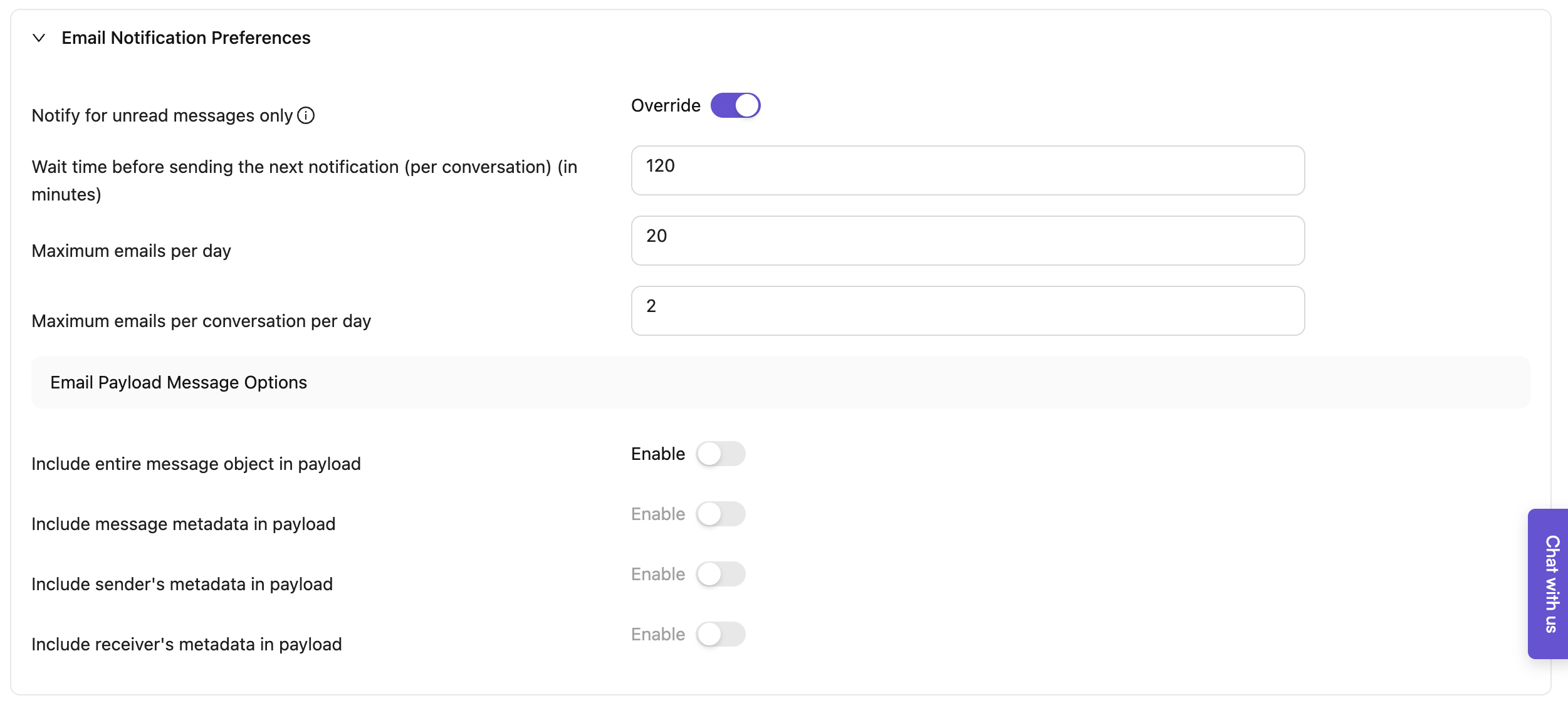 Control when CometChat sends unread-message emails and what data is included in each payload.