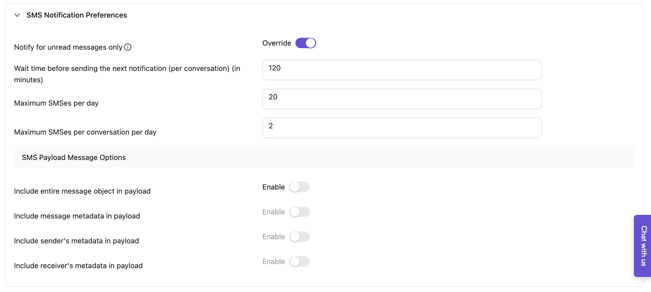 Control when CometChat sends unread-message SMS and what data is included in each payload.