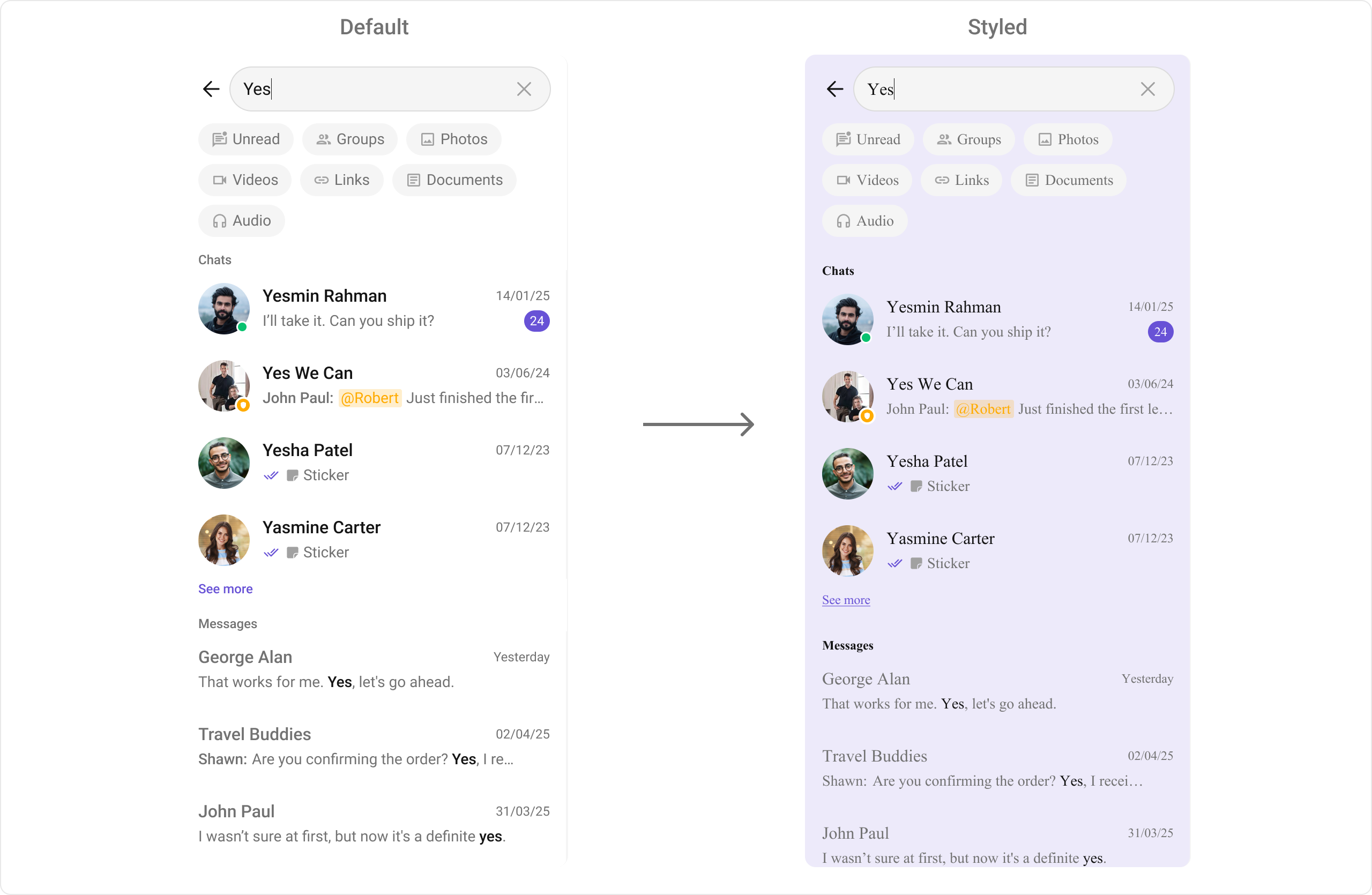 To fit your app’s design requirements, you can customize the appearance of the CometChatSearch component. We provide exposed methods that allow you to modify the experience and behavior according to your specific needs.