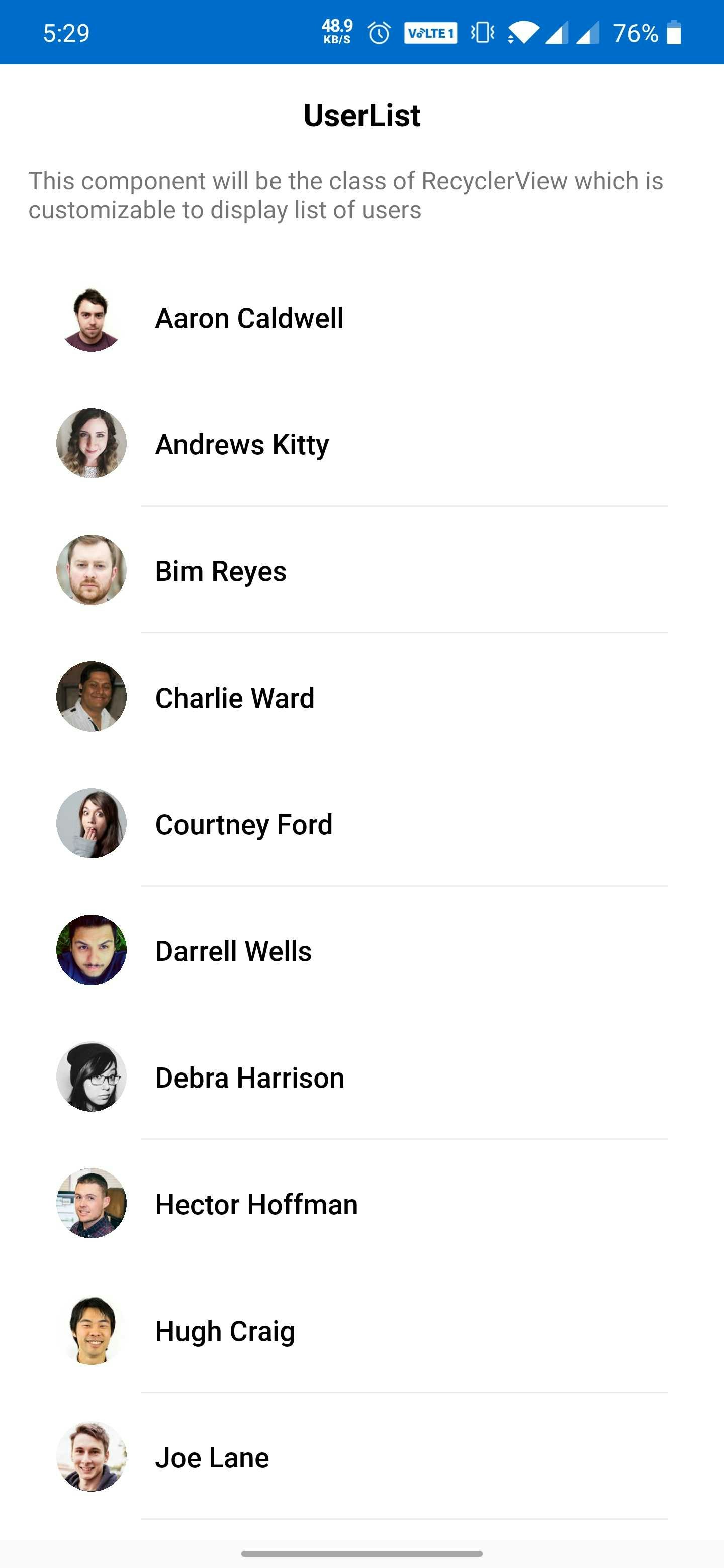 In your layout.xml add the following snippet to use the CometChatUserList. Adding the following code snippet will give you a fully working list of users.