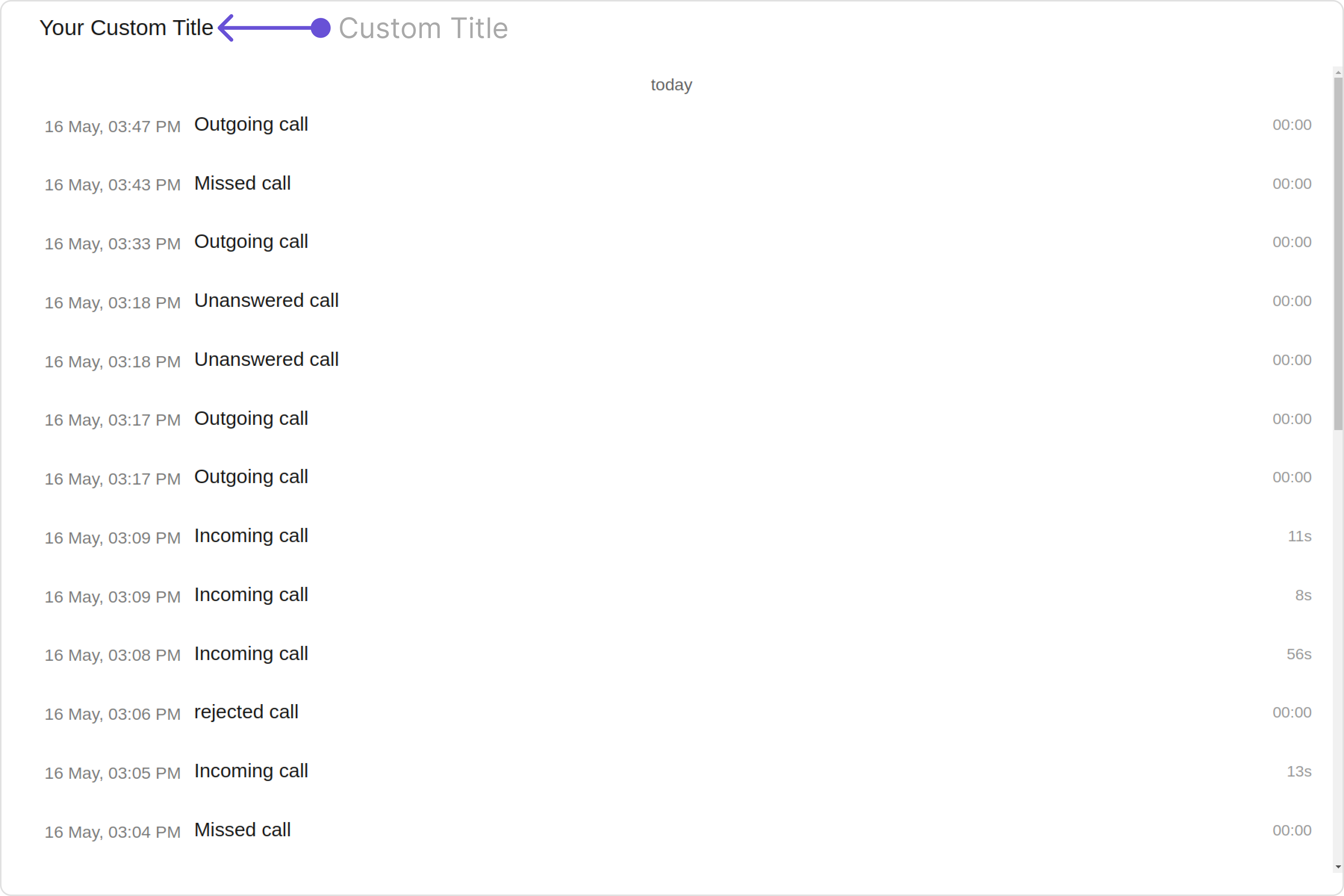 These are a set of small functional customizations that allow you to fine-tune the overall experience of the component. With these, you can change text, set custom icons, and toggle the visibility of UI elements. Here is a code snippet demonstrating how you can customize the functionality of the Call Log History component.