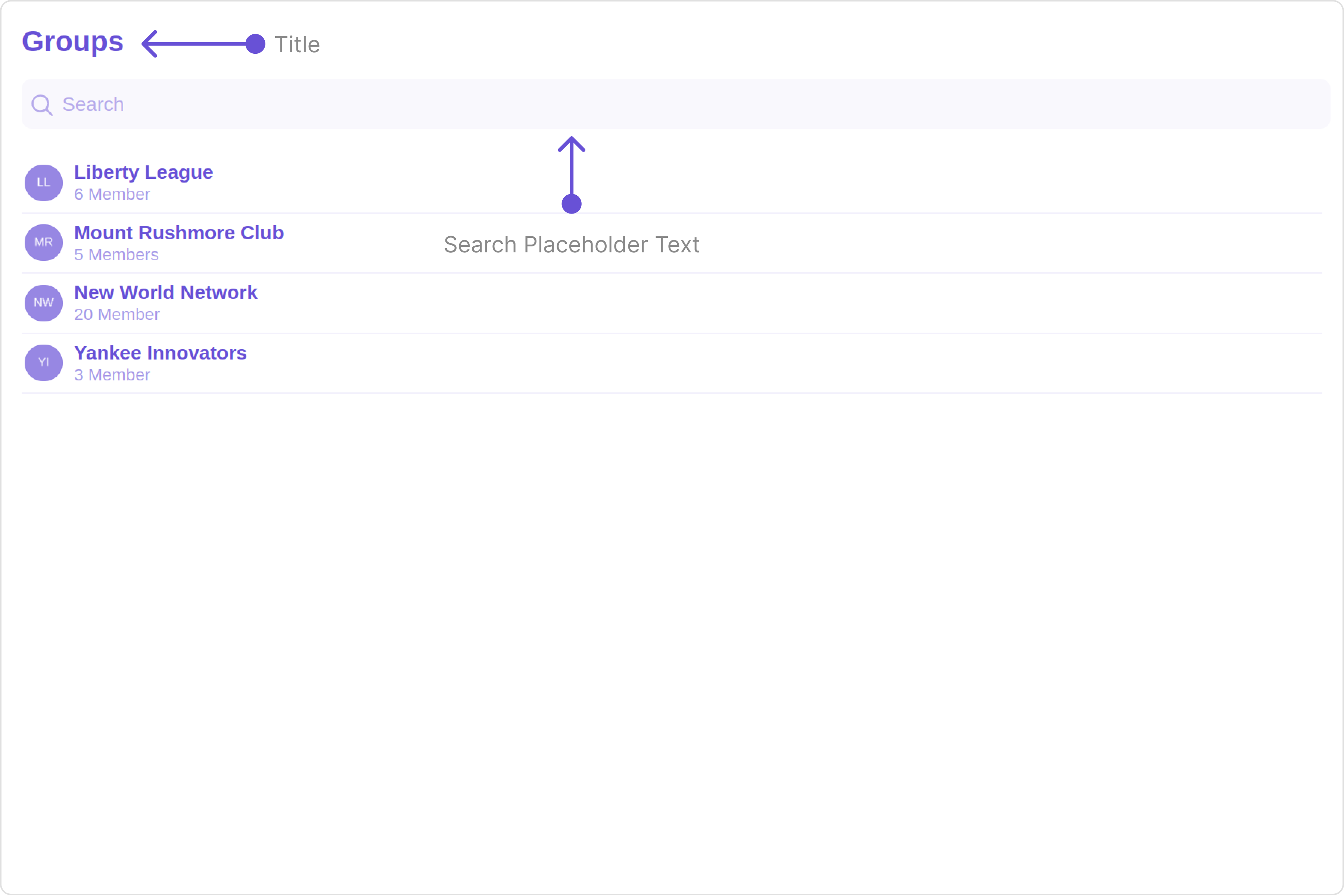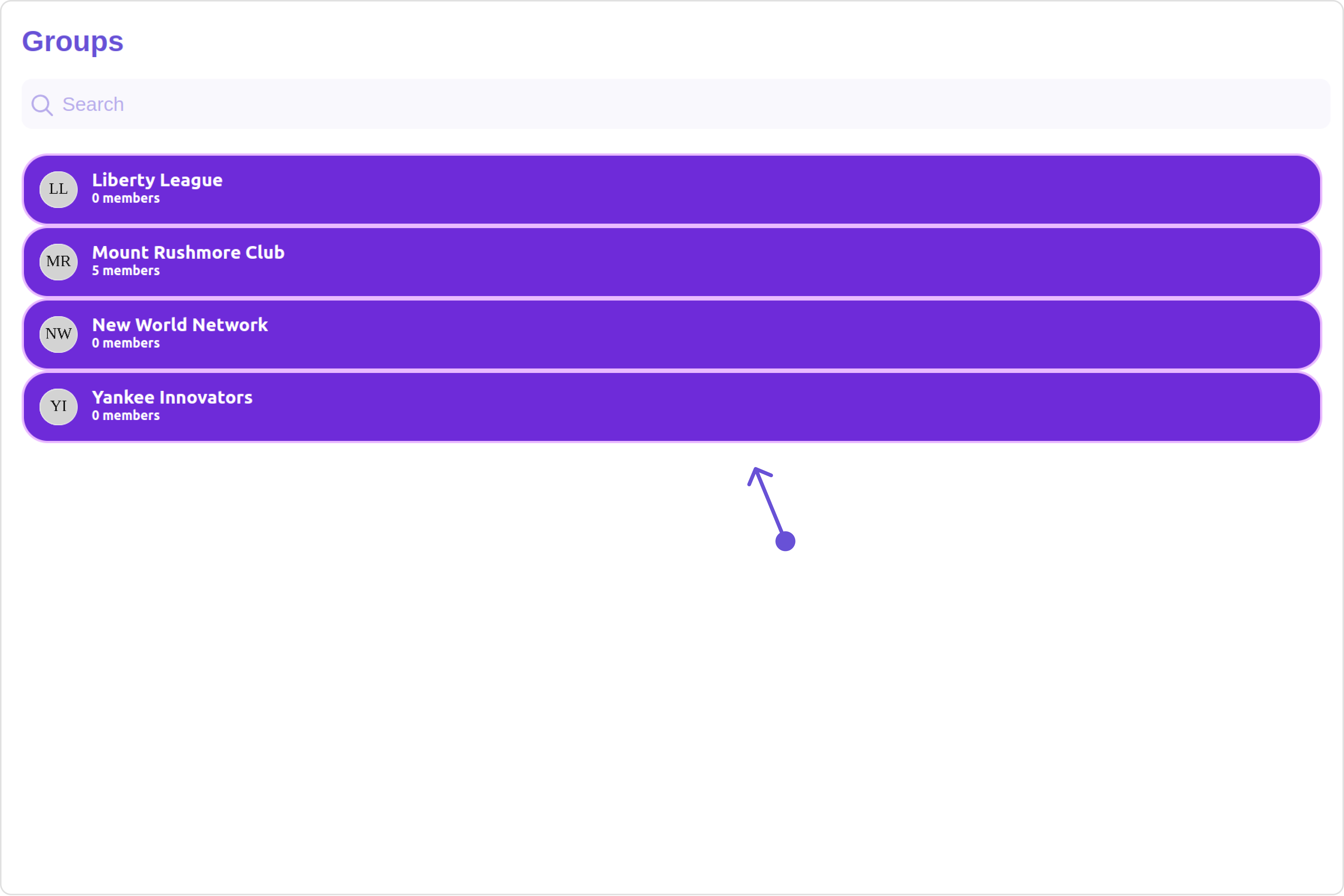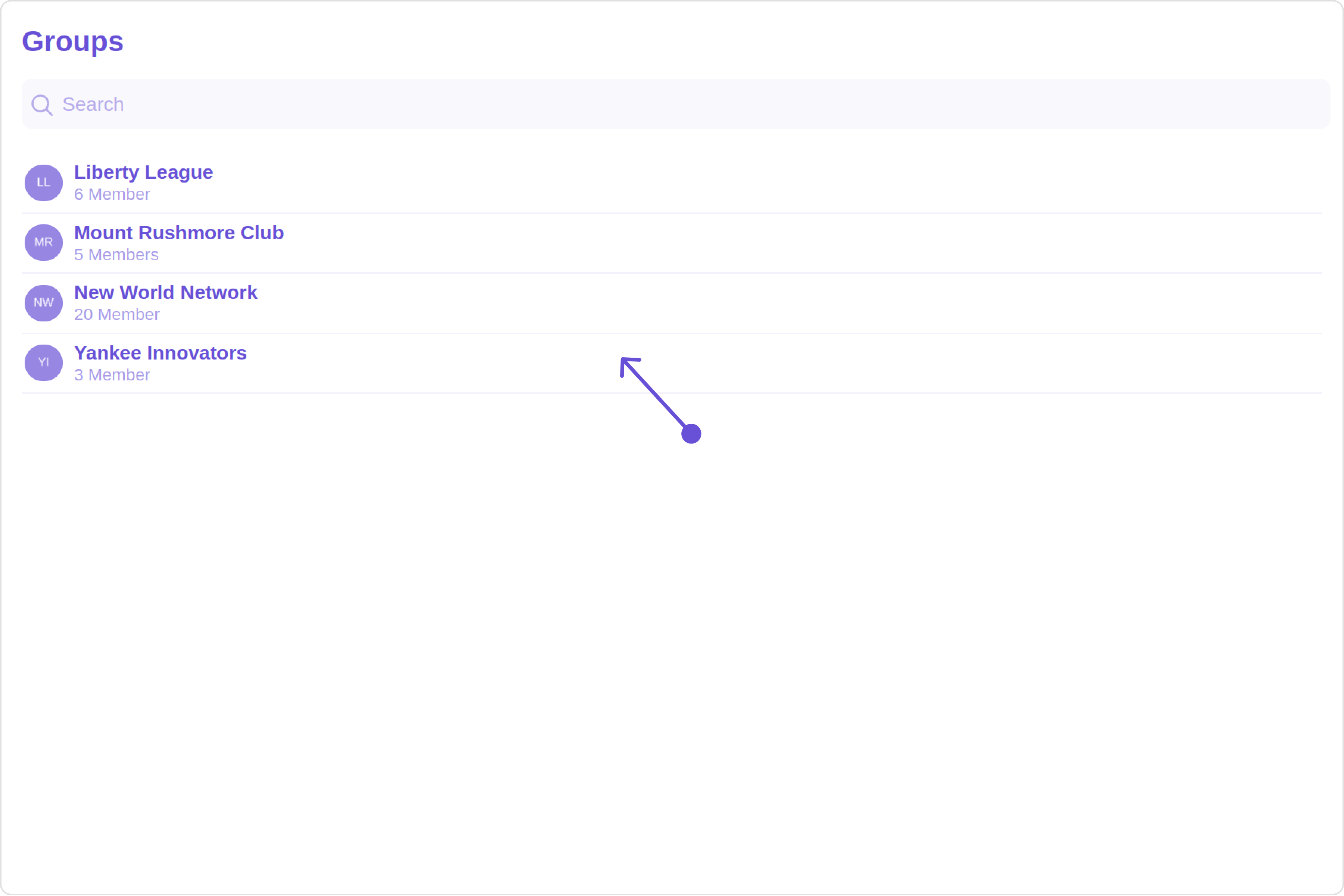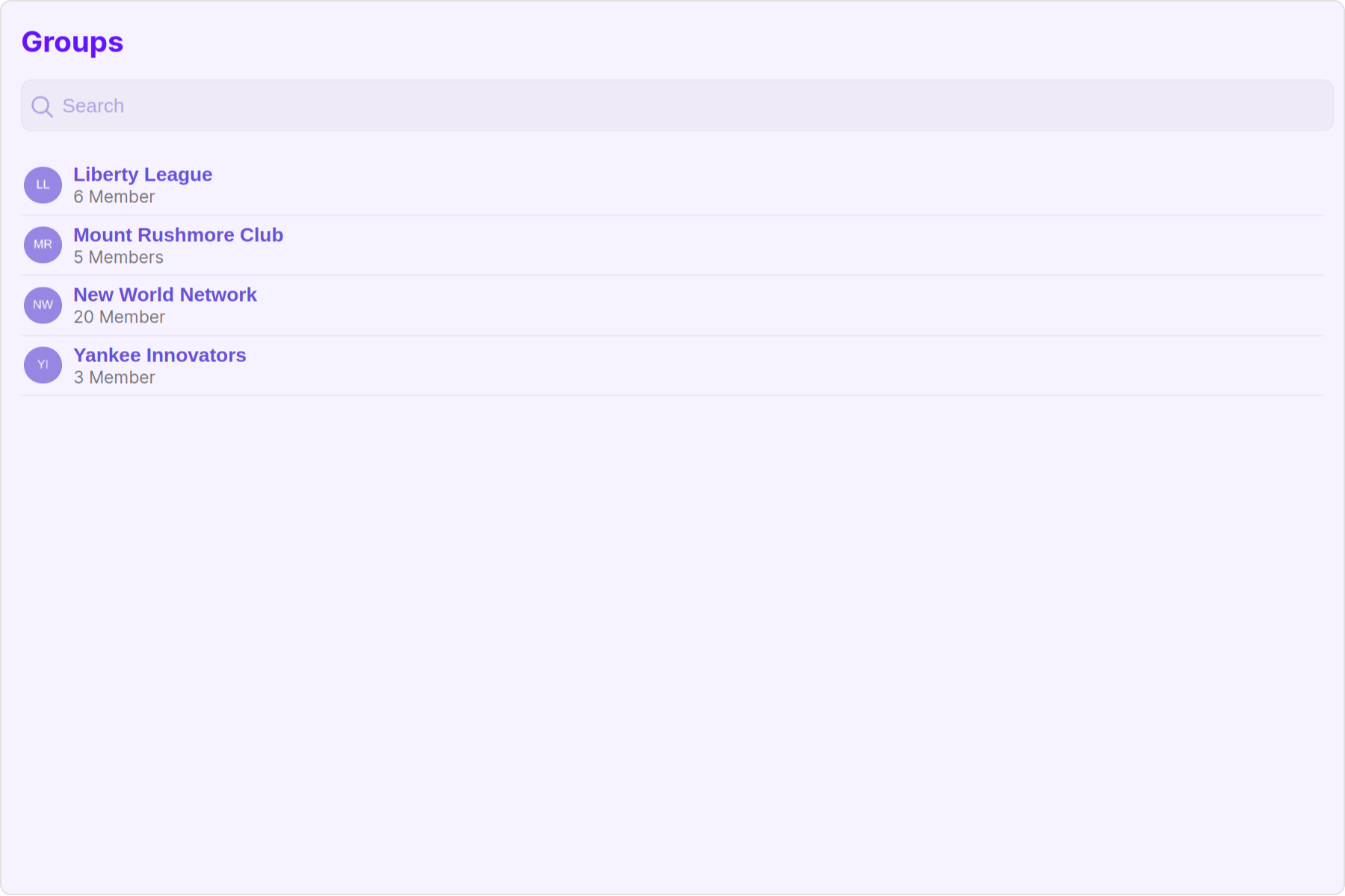 The Groups is a Component, showcasing an accessible list of all available groups. It provides an integral search functionality, allowing you to locate any specific groups swiftly and easily. For each group listed, the group name is displayed by default, in conjunction with the group icon when available. Additionally, it provides a useful feature by displaying the number of members in each group as a subtitle, offering valuable context about group size and activity level.