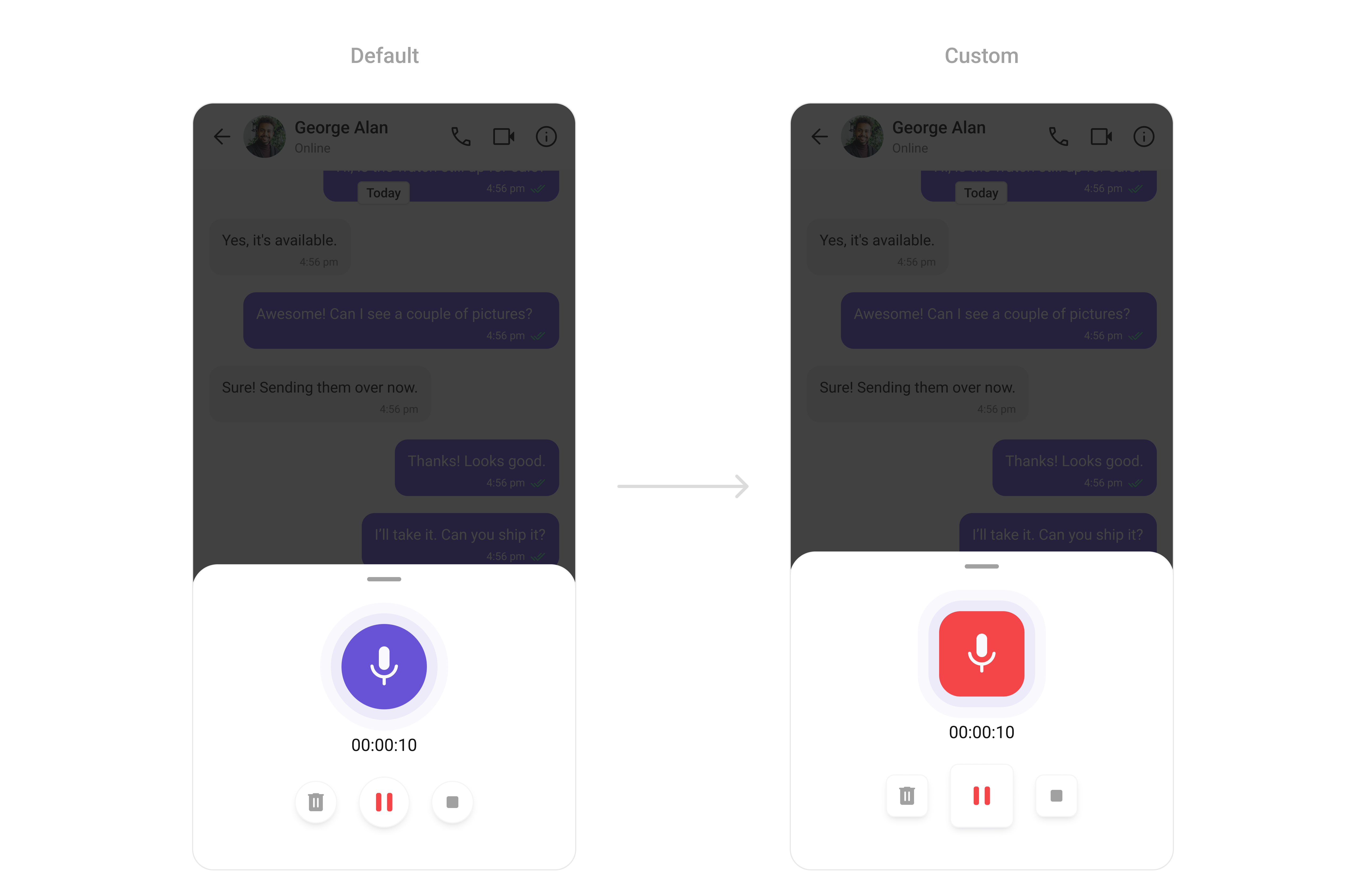 The CometChatMediaRecorder Component facilitates the recording of audio and video messages. It supports full customization of its recording controls, including button sizes, shapes, and colors, making it an integral part of your media-rich chat experience.
