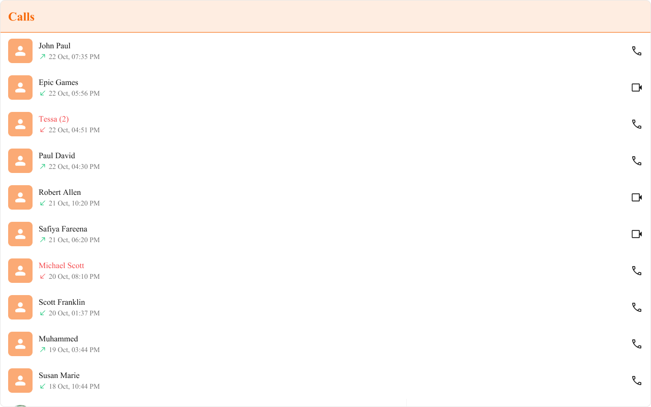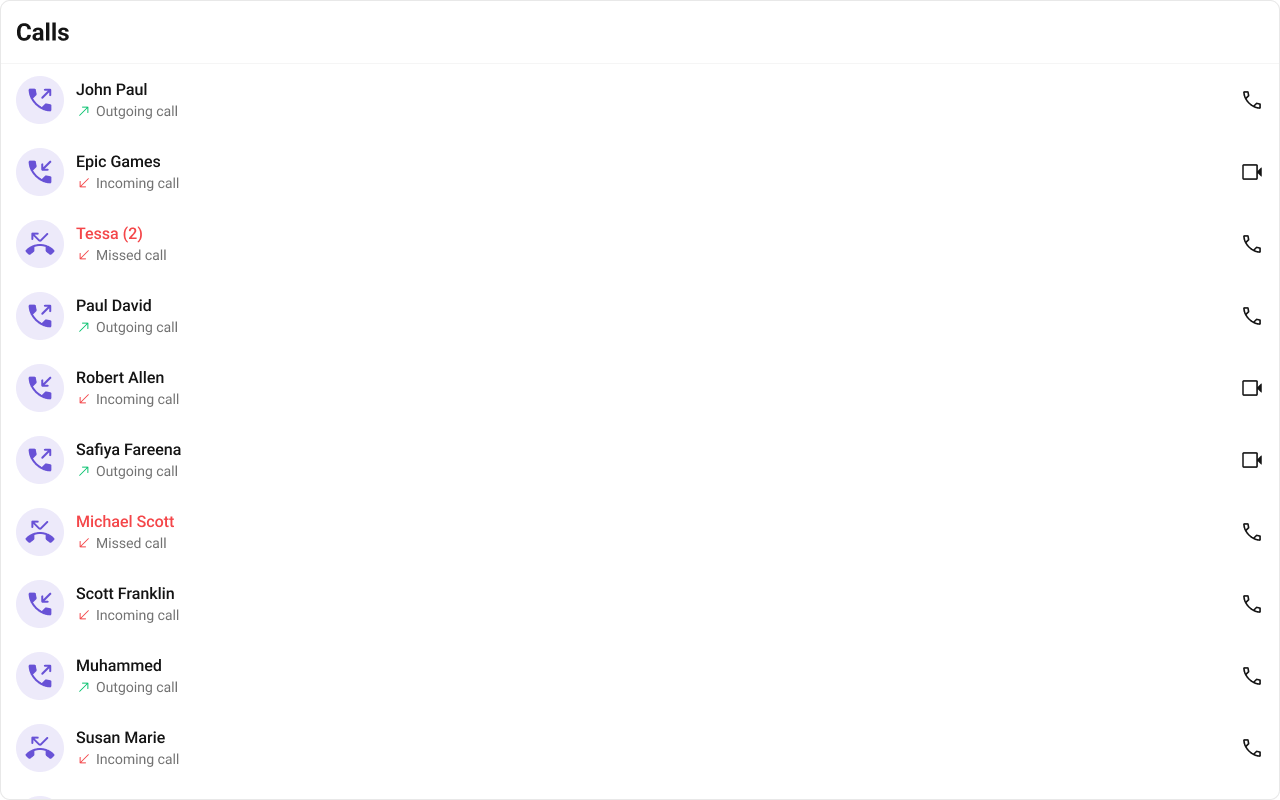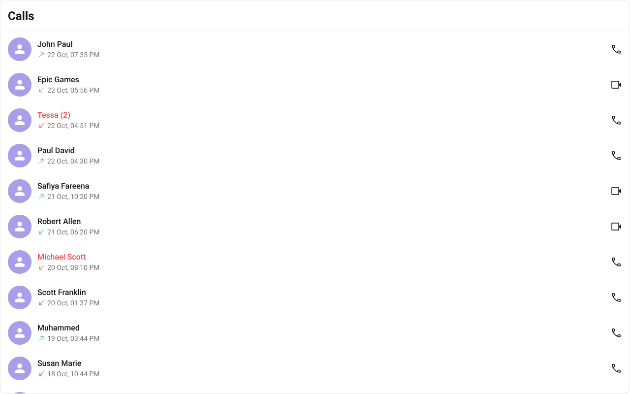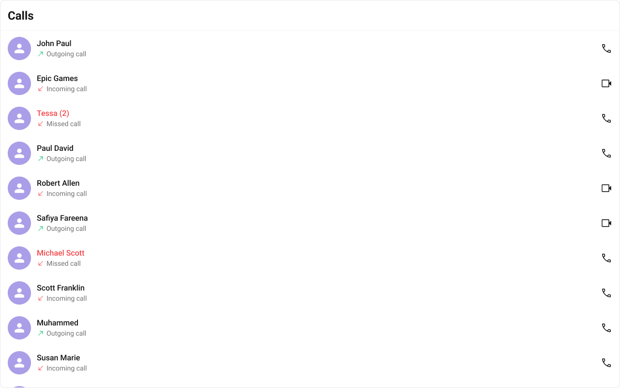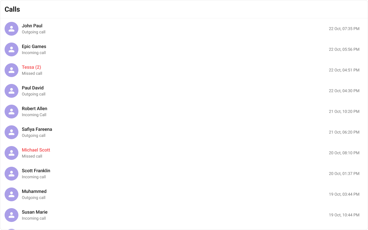 What you’re changing: Overview. Where to change it: Component props or CSS as shown below. Default behavior: UI Kit defaults. Override: Use the examples in this section. Verify: The UI reflects the change shown below.CometChatCallLogs is a Component that shows the list of Call Log available . By default, names are shown for all listed users, along with their avatar if available.