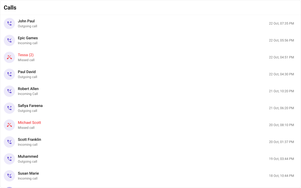 | No data | No call history | Verify the logged-in user has calls |