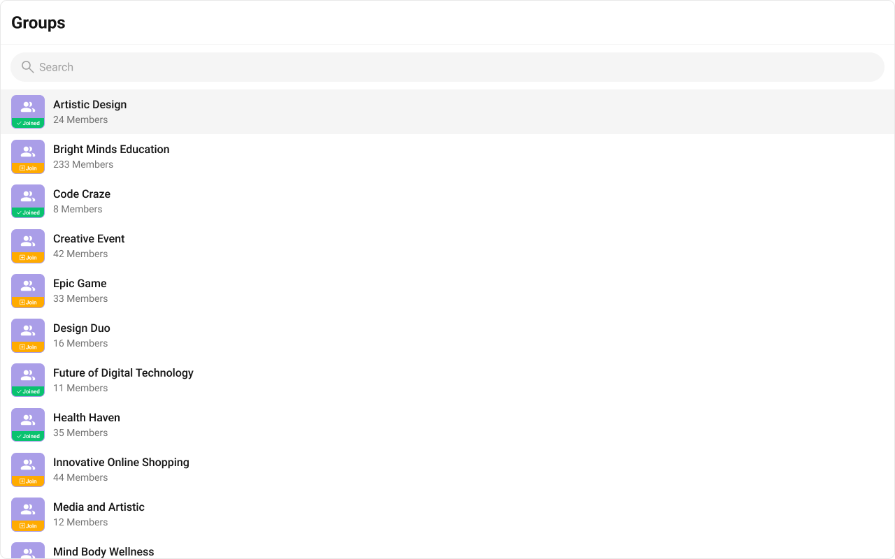 What you’re changing: Overview. Where to change it: Component props or CSS as shown below. Default behavior: UI Kit defaults. Override: Use the examples in this section. Verify: The UI reflects the change shown below. The Groups is a Component, showcasing an accessible list of all available groups. It provides an integral search functionality, allowing you to locate any specific groups swiftly and easily. For each group listed, the group name is displayed by default, in conjunction with the group icon when available. Additionally, it provides a useful feature by displaying the number of members in each group as a subtitle, offering valuable context about group size and activity level.