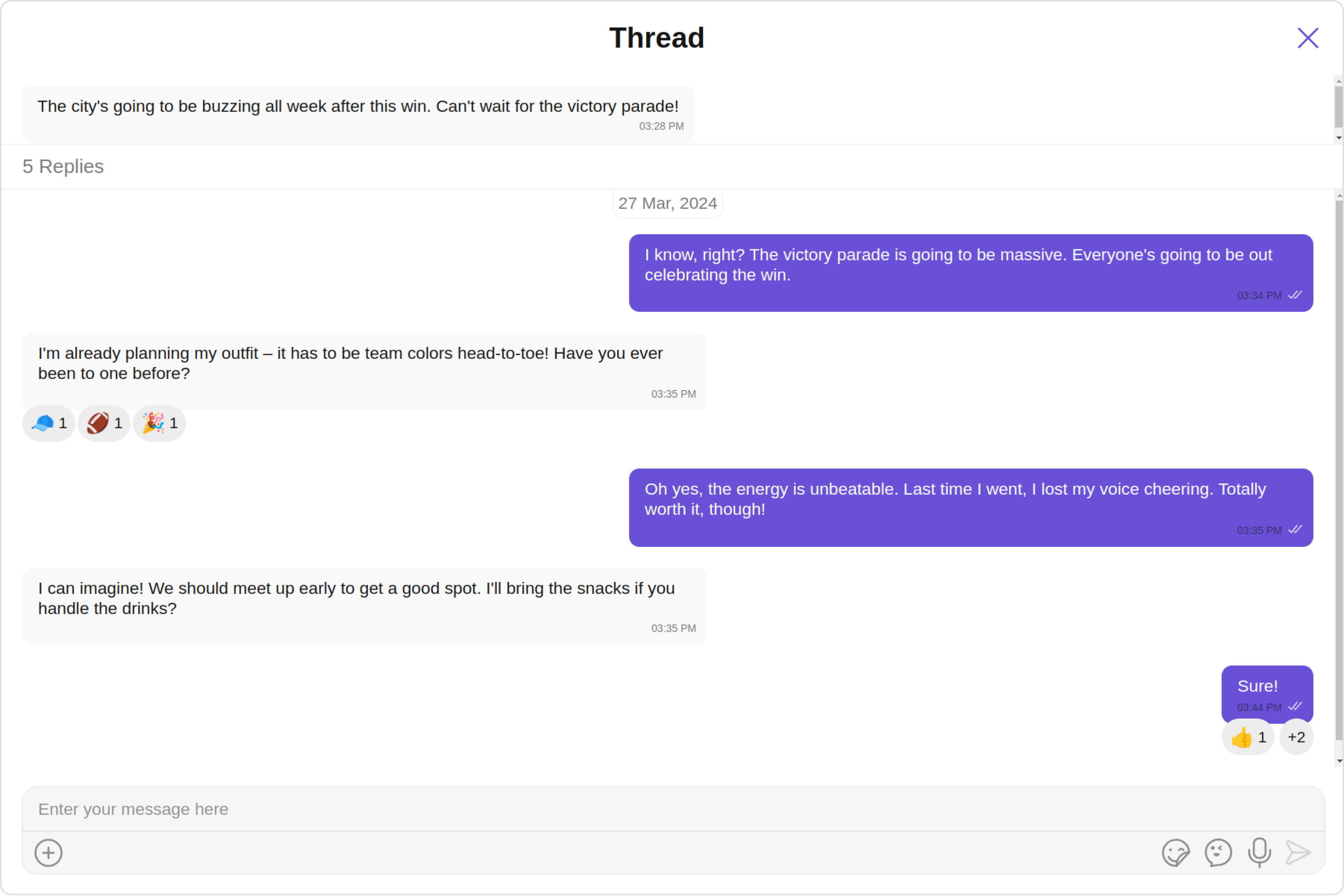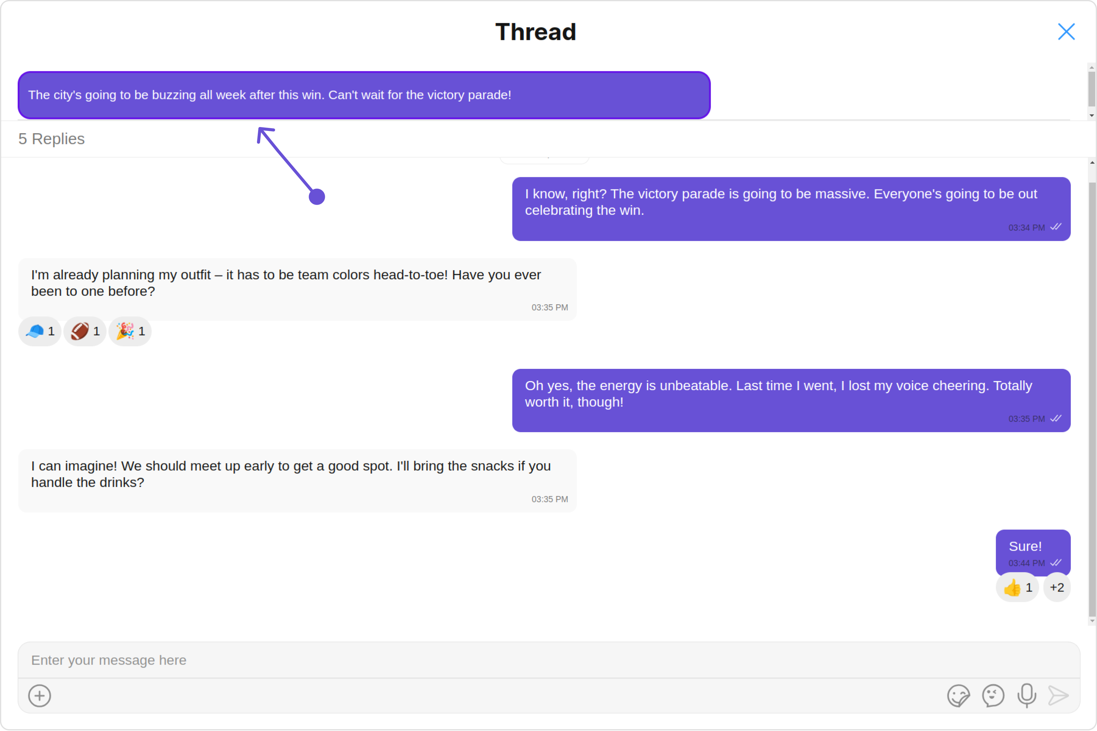 ThreadedMessages is a Composite Component that displays all replies made to a particular message in a conversation. By default, the parent message will be displayed at the top, the message composer will be at the bottom and between them a message list will contain all replies.